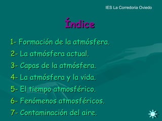 El documento resume las características fundamentales de la atmósfera. Explica que la atmósfera se formó hace 4500 millones de años a partir de gases volcánicos y que actualmente está compuesta principalmente de nitrógeno, oxígeno y argón. Describe las cuatro capas principales de la atmósfera y los fenómenos que ocurren en cada una. También detalla los roles del oxígeno, ozono, nitrógeno y dióxido de carbono para la vida, y explica conceptos clave como el tiempo atmosférico,