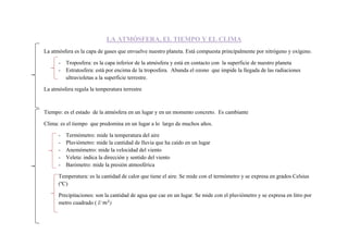 La atmósfera está compuesta principalmente de nitrógeno y oxígeno y se divide en la troposfera y estratosfera, las cuales regulan la temperatura terrestre. El tiempo describe el estado de la atmósfera en un momento y lugar específicos, mientras que el clima se refiere a las condiciones atmosféricas predominantes a lo largo de años. Diversos instrumentos como el termómetro, pluviómetro y anemómetro miden factores climáticos como la temperatura, precipitación y velocidad del viento.