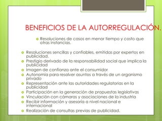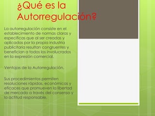 La autorregulación consiste en el establecimiento de normas claras y específicas por parte de la industria publicitaria para regularse a sí misma de manera beneficiosa y congruente para todos los involucrados. Sus procedimientos permiten resoluciones rápidas, económicas y eficaces que promueven la libertad de mercado a través del consenso y la responsabilidad.