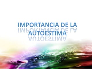 El documento describe la autoestima como un conjunto de percepciones, pensamientos y sentimientos hacia uno mismo que condiciona el aprendizaje y la creatividad. La autoestima tiene componentes cognitivo, afectivo y de comportamiento. Una alta autoestima implica aceptarse a sí mismo y sentirse importante y capaz, mientras que una baja autoestima lleva a pensar que uno no vale y a esperar ser menospreciado. El documento proporciona consejos para elevar la autoestima como aceptarse a uno mismo y no dejarse manipular por los