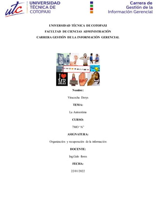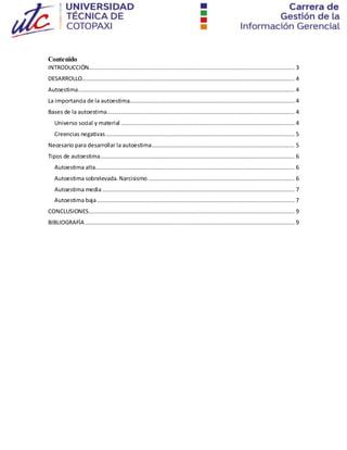 El documento trata sobre la autoestima, su importancia y las bases que la sustentan, destacando su influencia en la vida personal y las relaciones interpersonales. Se discuten diferentes tipos de autoestima: alta, sobrelevada (narcisismo), media y baja, así como la necesidad de autoconocimiento y autoaceptación para desarrollarla. Concluye que una autoestima sana es esencial para lograr objetivos y vivir de manera coherente y satisfactoria.