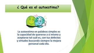 Este documento habla sobre la autoestima. Explica que la autoestima es un aprendizaje y que hay dos tipos principales: alta y baja. La autoestima baja se caracteriza por evitar situaciones de fracaso y retos por miedo, lo que impide aprender. También ofrece consejos para mejorar la autoestima baja como no juzgar a otros, tomar la crítica como consejo, hacer ejercicio, y celebrar los éxitos diarios.