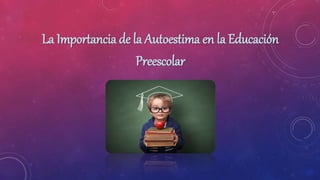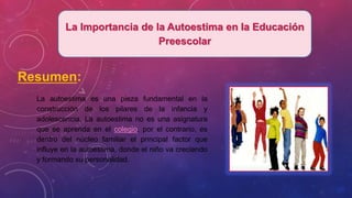 El documento describe la importancia de la autoestima en la educación preescolar. Explica que la autoestima se construye principalmente en la familia y depende del apoyo y respuestas positivas de los padres y maestros. También señala que los niños con una buena autoestima tendrán más confianza, interés y actitud positiva para aprender, mientras que una baja autoestima puede causar problemas como la depresión.