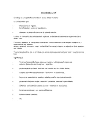 El documento habla sobre la importancia de la autoestima empresarial. Explica que la autoestima es fundamental para las relaciones interpersonales, intrapersonales y con el entorno laboral. También describe formas para mejorar la autoestima como concentrarse en lo positivo, no compararse con otros, y aceptarse a uno mismo. Finalmente, señala que los gerentes juegan un papel clave en la construcción de la autoestima de los empleados a través del diseño de programas y la promoción de una cultura de excelencia y creatividad.