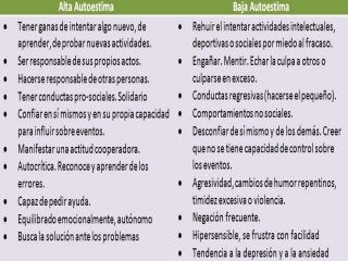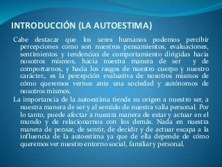 La autoestima es la percepción evaluativa que tenemos de nosotros mismos, afectando nuestra conducta y relaciones. Se clasifica en alta, baja y media, con distintos grados de autoaceptación y autoeficacia, y su desarrollo es crucial para el bienestar emocional y social. Factores como el sexismo y el contexto social pueden influir negativamente en la autoestima, lo que puede llevar a trastornos psicológicos y afectar la calidad de vida.