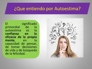 El documento define la autoestima como la confianza en la propia capacidad de pensar y tomar decisiones. Explica que la autoestima implica confiar en uno mismo y en el derecho a triunfar y ser feliz. Identifica varios componentes de la autoestima como el juicio personal, la aceptación de uno mismo, el aspecto físico y el patrimonio psicológico. También describe prácticas para desarrollar una alta autoestima como vivir conscientemente, aceptarse a uno mismo y asumir la responsabilidad personal.