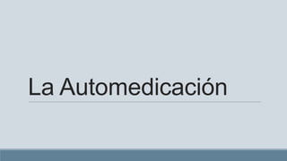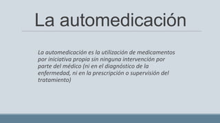 La automedicación puede definirse como el uso de medicamentos por iniciativa propia sin supervisión médica. Si bien puede ser útil para problemas menores y durante periodos limitados, también conlleva riesgos como efectos adversos, interacciones con otros fármacos, o el ocultar otras enfermedades. La automedicación responsable requiere educación sobre los medicamentos y cuando buscar atención médica. Algunos fármacos como los antibióticos siempre necesitan receta para prevenir resistencias.