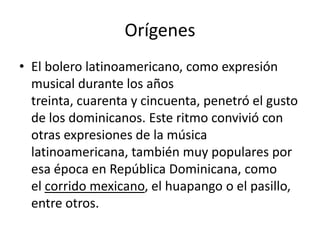 La bachata se originó en la República Dominicana a partir del bolero y otros ritmos latinoamericanos populares en los años 30-50. Fue despreciada como "música de amargue" hasta los años 80 cuando artistas como Juan Luis Guerra la popularizaron y la convirtieron en un género que ha penetrado todos los estratos sociales en República Dominicana y a nivel internacional. La bachata se baila en pareja de forma sensual y rítmica al compás de 4/4, distinguiéndose por el movimiento de cader