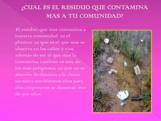 El plástico es el residuo que más contamina la comunidad debido a que es el más común en las calles y ríos. Es uno de los más peligrosos ya que tarda más de 500 años en descomponerse. Para mitigar sus efectos, es necesario concientizar a la gente para que no lo arroje a las calles y realizar campañas de limpieza y reciclaje.