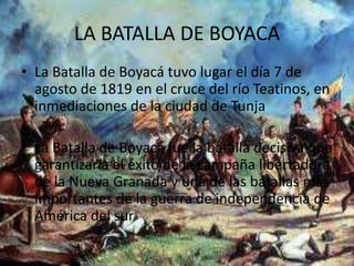 La Batalla de Boyacá tuvo lugar el 7 de agosto de 1819 en Colombia y fue la batalla decisiva de la campaña libertadora liderada por Simón Bolívar que garantizó la independencia de la Nueva Granada de España. Las tropas republicanas de aproximadamente 2,850 hombres al mando de Bolívar y Santander derrotaron a las 2,670 tropas realistas españolas comandadas por José María Barreiro, dando fin al dominio español en la región.