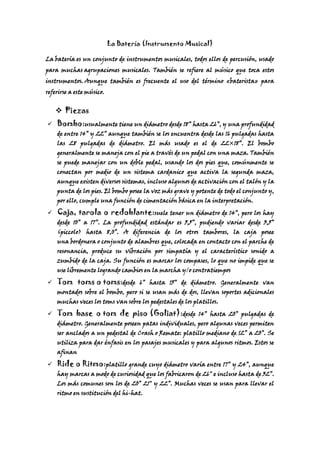 La batería es un conjunto de instrumentos de percusión que incluyen el bombo, la caja, los tom toms, el tom de piso, los platillos como el crash ride, y los hi-hats. Cada pieza tiene un rango específico de tamaños y se usa para lograr efectos musicales diferentes como marcar el ritmo, dar énfasis o efectos especiales. La batería se toca con baquetas o escobillas de diferentes materiales, tamaños y pesos.