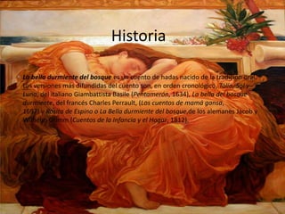 Este documento resume la trama de "La bella durmiente del bosque", un cuento de hadas popular. Narra la historia de una princesa maldecida a dormir por 100 años luego de pincharse el dedo con un huso, y cómo es despertada por un príncipe que la rescata. También describe cómo la malvada reina madre intenta matar a la princesa y su familia, pero es derrotada por el rey al final.