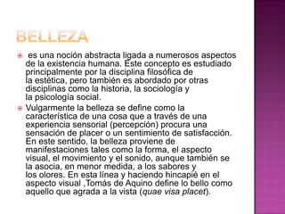 El documento trata sobre el concepto de belleza. Define la belleza como una noción abstracta estudiada por la filosofía estética y otras disciplinas. Explica que la belleza se percibe a través de los sentidos y provoca placer. Luego discute la belleza humana, distinguiendo entre belleza interior (como la personalidad) y exterior (lo físico). Finalmente, cubre temas como la atracción, la moda y la estética como rama filosófica del estudio de la belleza.