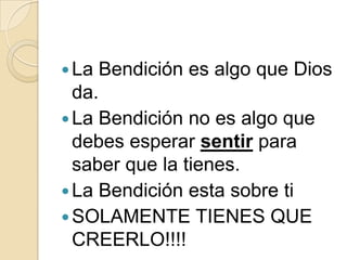 1. La bendición es un don que proviene de Dios. 2. La bendición no se basa en sentimientos sino en creer la promesa de Dios. 3. Las bendiciones de Dios se manifiestan a través de palabras de bendición dichas con fe.