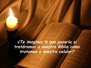 Este documento compara la Biblia con un celular y sugiere que deberíamos tratar la Biblia con el mismo nivel de importancia y uso frecuente que damos a nuestros celulares. Propone que llevemos la Biblia con nosotros en todo momento, la consultemos a menudo durante el día, y la usemos como una herramienta para comunicarnos con amigos. Además, ofrece una lista de "números de emergencia" de versículos bíblicos para consultar en diferentes situaciones difíciles.