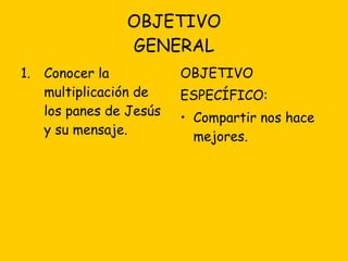 Este documento narra el milagro bíblico de la multiplicación de los panes y los peces por Jesús. Jesús fue a una ciudad con sus apóstoles, donde curó a los enfermos y habló del Reino de Dios. Cuando anocheció, los apóstoles no tenían suficiente comida para las 5,000 personas, pero Jesús tomó cinco panes y dos peces, los partió y repartió entre todos hasta que quedaron satisfechos. Este milagro enseña que cuando compartimos lo que tenemos, somos más felices y estamos más c