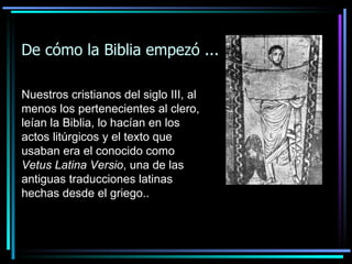 Este documento resume la historia de la Biblia en España desde los primeros cristianos que leían la Biblia en latín en el siglo III hasta las traducciones modernas. Destaca traducciones importantes como la Biblia del Oso de 1569, la primera completa en castellano, y el desarrollo de estudios bíblicos en España en los siglos XX y XXI.