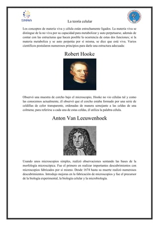 Este documento describe la historia y desarrollo de la teoría celular. Explica que Robert Hooke fue el primero en observar células bajo el microscopio en el siglo XVII. En el siglo XIX, Matthias Schleiden y Theodor Schwann propusieron la teoría celular al generalizar que todos los organismos están compuestos de células. Rudolf Virchow estableció que todas las células provienen de otras células preexistentes. La teoría celular se aceptó definitivamente con los experimentos de Pasteur sobre la reprodu