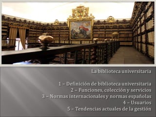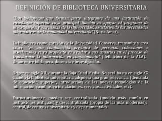 El documento describe el papel y la evolución de las bibliotecas universitarias. Explica que su función principal es apoyar la investigación y enseñanza de la universidad satisfaciendo las necesidades informativas de la comunidad universitaria. También destaca la importancia de financiación adecuada y que los bibliotecarios participen activamente en la política universitaria.