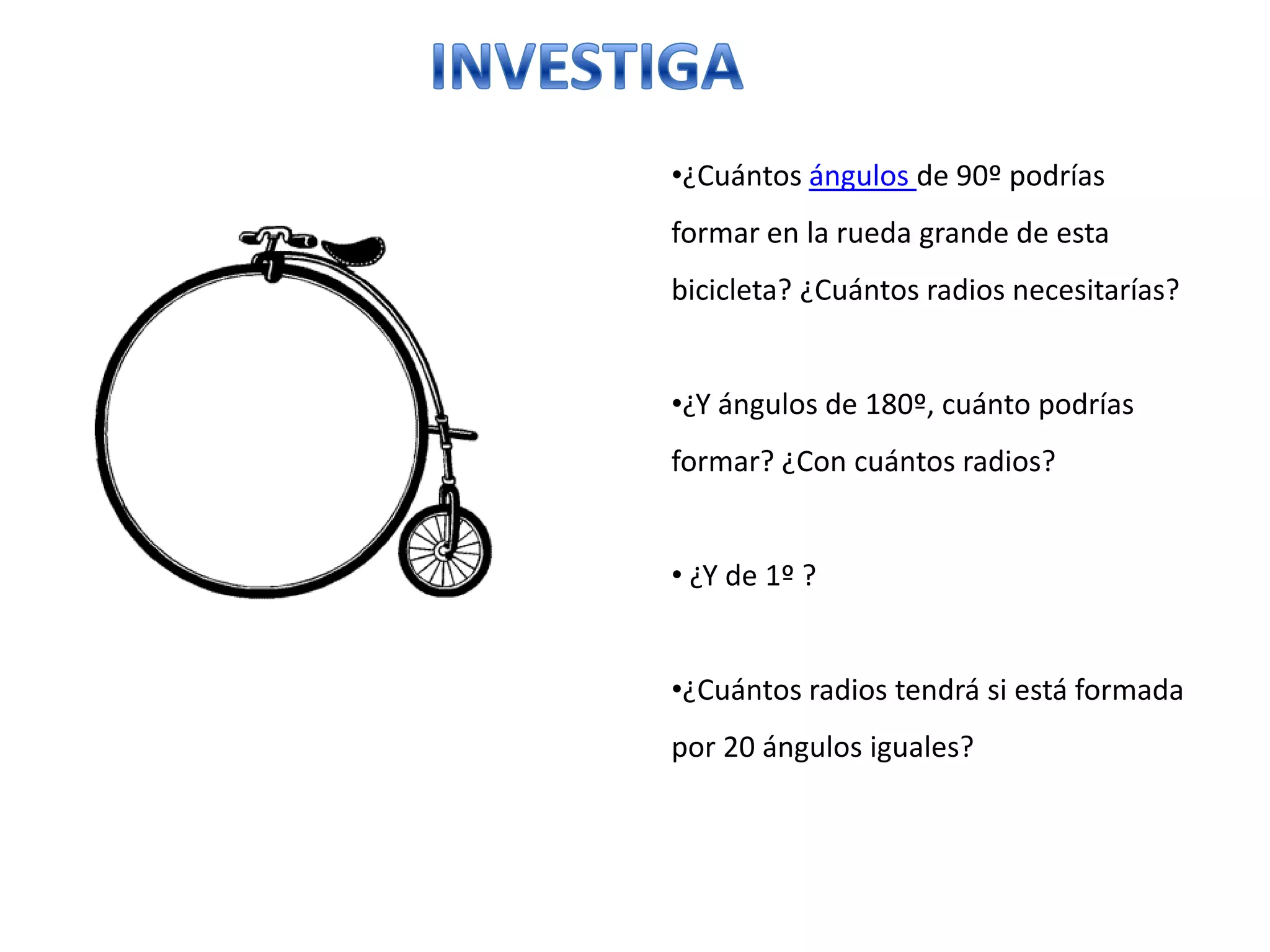 Este documento presenta una serie de preguntas sobre las propiedades de los ángulos y las ruedas de las bicicletas. Se pregunta sobre el número de ángulos de 90°, 180° y 1° que se pueden formar en una rueda de bicicleta con diferentes números de radios, y sobre la suma total de los ángulos iguales formados por los radios. También se piden detalles sobre ángulos específicos en ruedas de colores ilustradas, como sus medidas en grados, relaciones y clasificaciones.