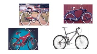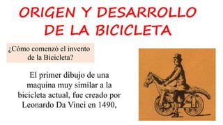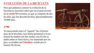 El documento resume la historia y evolución de la bicicleta desde sus orígenes en los dibujos de Leonardo da Vinci en 1490 hasta su forma moderna. Algunos hitos incluyen la creación de la draisina en 1817, la adición de pedales en 1855, el desarrollo del velocípedo en 1862, el aumento del tamaño de la rueda delantera en la década de 1860, y la invención de la cadena en 1885. La bicicleta ha evolucionado de un simple juguete a un popular vehículo de transporte.
