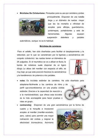 Este documento describe los diferentes tipos de bicicletas, incluyendo bicicletas urbanas, de montaña, de carretera, BMX y más. Explica las características clave de cada tipo, como la geometría, tamaño de ruedas, suspensión y uso previsto. También resume brevemente la historia de la bicicleta y su evolución a través del tiempo, así como su importancia para el transporte y el ejercicio.