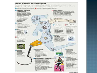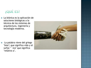 La biónica aplica soluciones biológicas a la ingeniería y tecnología para desarrollar implantes y prótesis como los implantes cocleares para la audición o los brazos y piernas biónicas que imitan las funciones naturales. Algunos ejemplos notables son los implantes cocleares que envían señales eléctricas al cerebro para compensar la pérdida auditiva y los brazos biónicos controlados por señales cerebrales como el de Jessie Sullivan que perdió sus brazos en un accidente eléctrico