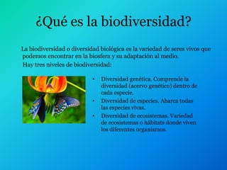El documento trata sobre la biodiversidad y explica que existe en tres niveles: genética, de especies y de ecosistemas. Detalla por qué España tiene una alta biodiversidad debido a su ubicación geográfica y conservación de hábitats naturales. Finalmente, enfatiza la importancia de mantener la biodiversidad por razones ecológicas, económicas y científicas, y los peligros que la amenazan, como la destrucción de hábitats y el cambio climático.
