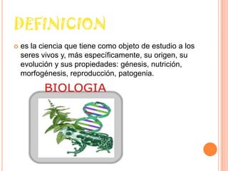 La biología estudia los seres vivos, incluyendo su origen, evolución y propiedades como la nutrición, reproducción y patogenia. Examina tanto las características individuales de los organismos como las especies y sus interacciones con el medio ambiente, con el objetivo de establecer las leyes generales y principios que rigen la vida orgánica. Las clasificaciones de los seres vivos van desde la distinción básica entre animales y plantas hasta los actuales sistemas cladísticos con tres dominios.