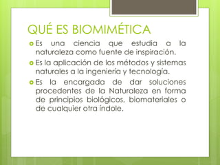 La biomimética es una ciencia que utiliza la naturaleza como fuente de inspiración para desarrollar soluciones en ingeniería y tecnología, replicando métodos, imitando mecanismos y principios organizacionales. Sus objetivos incluyen mejorar la calidad de vida, aumentar la eficiencia energética y encontrar soluciones innovadoras, ejemplificadas en innovaciones como el velcro, tren bala japonés y turbinas submarinas. A pesar de su creciente uso y expansión, persiste la inquietud sobre posibles efectos adversos en la salud y el medio ambiente.
