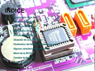 El documento describe los componentes clave de la BIOS de una computadora, incluyendo su hardware, software, fabricantes, actualizaciones y funciones. Explica que la BIOS es el vínculo entre el hardware y software, contiene controladores para que funcione el sistema, y puede actualizarse para admitir nuevos componentes. También cubre temas como la configuración del menú CMOS, cambiar la batería y borrar la BIOS.