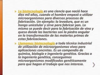 La biotecnología ha existido por miles de años cuando los humanos empezaron a usar microorganismos como levadura en procesos de fabricación como el pan, vino y queso. La biotecnología moderna utiliza técnicas de ingeniería genética para modificar microorganismos y aprovecharlos para aplicaciones específicas como la descontaminación de suelos y aguas contaminadas mediante bacterias que degradan contaminantes.