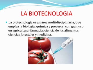 La biotecnología es una área multidisciplinaria que emplea la biología, química y procesos para crear o modificar productos y procesos utilizados en agricultura, farmacia, ciencia de los alimentos, ciencias forestales y medicina. Se refiere a la aplicación tecnológica de sistemas biológicos y organismos vivos. Fue probablemente el ingeniero húngaro Karl Ereky quien usó primero este término en 1919.
