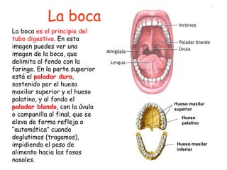 La boca delimita el principio del tubo digestivo. Contiene el paladar duro y blando, la lengua, dientes y glándulas salivales. La lengua y saliva ayudan a formar el bolo alimenticio que es empujado hacia la faringe durante la deglución para evitar la asfixia. La saliva contiene enzimas como la amilasa y lisozima que comienzan la digestión de almidón y ayudan a prevenir infecciones.