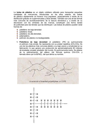 Este documento describe los diferentes tipos de bolsas de plástico, sus materiales de composición como polietileno de baja y alta densidad y polipropileno, y sus usos comunes como envases para alimentos, transporte de mercancías y basura. Explica que aunque el plástico se deriva de biomasa, los enlaces que lo componen no son biodegradables para los organismos vivos debido a que requieren demasiada energía para romperlos.