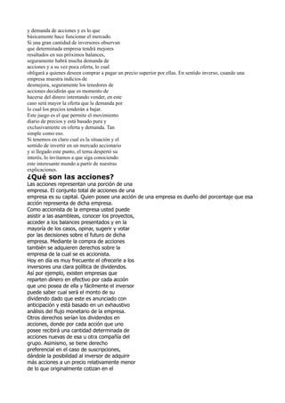 El documento explica qué son la bolsa y el mercado de valores. La bolsa conecta a empresas que desean abrir su capital a inversionistas. Las empresas ofrecen parte de su capital accionario a cambio de dinero para financiar nuevos proyectos. Los inversionistas compran acciones con la esperanza de que su valor aumente si la empresa tiene éxito. El movimiento en los precios de las acciones se basa en la oferta y demanda impulsada por la evaluación de los inversionistas sobre el desempeño futuro de las empresas.