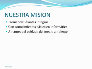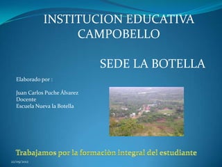 El documento presenta la misión y organización de la Institución Educativa Campobello sede La Botella. Su misión es formar estudiantes íntegros con conocimientos básicos en informática y amantes del medio ambiente, ofreciendo educación desde preescolar hasta quinto grado y practicas deportivas, con docentes idóneos y aprovechando el potencial humano.