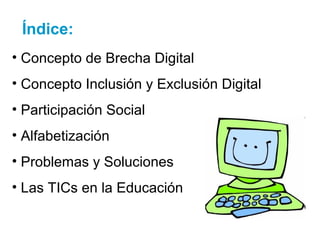 La brecha digital se refiere a la diferencia entre aquellos que tienen acceso a las tecnologías de la información y la comunicación (TIC) y aquellos que no lo tienen, debido a factores como los recursos económicos, la localización geográfica y el nivel educativo. La inclusión digital permite el acceso a las TIC para mejorar las condiciones de vida, mientras que la exclusión digital rechaza su uso debido a limitaciones. Las soluciones propuestas incluyen el desarrollo de infraestructura, la alfabetiz