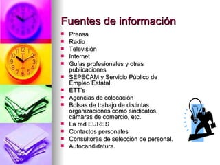 El documento describe las diferentes fuentes y métodos para buscar empleo, incluyendo prensa, internet, agencias de empleo, y contactos personales. Explica cómo responder a una oferta de trabajo proveyendo información relevante como formación, experiencia, y detalles del puesto. También describe los perfiles preferidos y rechazados por las empresas, haciendo énfasis en la imagen, actitudes, habilidades, y personalidad del candidato.