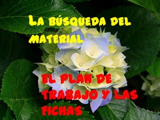 Este documento presenta información sobre la búsqueda de material y la creación de fichas para una tesis. Explica que es importante elaborar un plan de trabajo con un índice provisional y una introducción para organizar las ideas. También destaca la importancia de crear diferentes tipos de fichas como fichas bibliográficas, de lectura, y de trabajo para registrar la información encontrada de manera ordenada y facilitar la investigación.