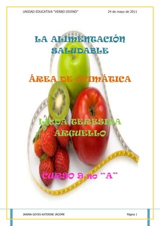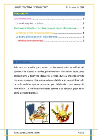 El documento habla sobre la importancia de una alimentación saludable y balanceada. Explica que una dieta equilibrada que incluya los principales grupos de alimentos como frutas, verduras, granos, proteínas y grasas es fundamental para el bienestar y la prevención de enfermedades. También destaca la importancia de comer de forma relajada y masticar bien para una buena digestión.