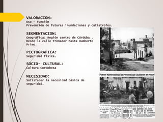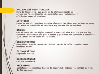 El documento habla sobre el arroyo La Cañada en la ciudad de Córdoba, Argentina. Desde su nacimiento en las sierras chicas con una longitud de 28 km, los cordobeses se han preocupado por embellecer su trayecto a través de la ciudad. En 1944 se inauguró el encauzamiento de 3 km del arroyo con murallones de piedra y puentes, conteniendo el agua y convirtiéndose en un ícono cultural. La desembocadura del arroyo forma parte de un complejo de torres altas y ha recib