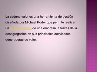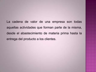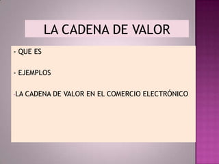El documento describe la cadena de valor y proporciona ejemplos de cadenas de valor en diferentes industrias como la manufactura, la edición y el cine. Luego explica que el comercio electrónico permite a las empresas integrarse digitalmente con clientes y proveedores para mejorar el análisis de información, la gestión interna y el conocimiento del mercado y la competencia. Además, la integración digital puede reducir ineficiencias en procesos como el aprovisionamiento y la gestión de inventarios para lograr ahorros de costos.