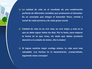 La calidad de vida se define como un equilibrio de variables que promueven el bienestar físico, mental y social, destacando la importancia de vivir mejor en lugar de vivir más. Se ofrecen consejos prácticos para mejorar la calidad de vida, como disfrutar de la vida, conocerse a uno mismo, compartir tiempo con seres queridos, expresar sentimientos, perdonar, hacer buenas acciones, mantener una actitud positiva y cuidar de la salud. El documento enfatiza que mejorar la calidad de vida es posible al adoptar actitudes y hábitos que fomenten el bienestar personal.