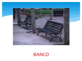 Este documento lista elementos comunes que se pueden encontrar en una calle urbana como bancos, papeleras, farolas, contenedores, señales, vallas, fuentes, buzones, escaparates, aceras, toldos, semáforos para coches y peatones, casas, pasos de cebra, parques, plazas y diferentes tipos de tiendas como zapaterías, carnicerías, farmacias, floristerías, joyerías, pastelerías, peluquerías, pescaderías, supermercados y tiendas de muebles y