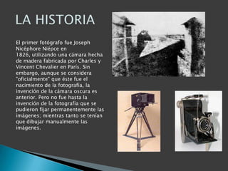 Joseph Nicéphore Niépce fue el primer fotógrafo en 1826 al capturar la primera fotografía utilizando una cámara de madera y un proceso llamado heliografía que permitió fijar permanentemente la imagen por primera vez, mientras que anteriormente las imágenes capturadas en cámaras oscuras tenían que ser dibujadas a mano.