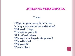 Este documento presenta una serie de técnicas cinematográficas para lograr un mayor poder persuasivo con la cámara, incluyendo el tamaño de plano, profundidad de campo, movimientos de cámara, ángulo y altura. Explica técnicas como el plano general, plano medio, primer plano, panorámica y zoom, y cómo cada una puede influir en la percepción del espectador. El objetivo es enseñar estas herramientas para que la imagen adquiera significado y atraiga la atención