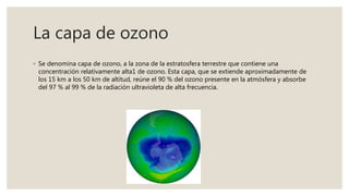 La capa de ozono se extiende entre los 15 y 50 km de altitud y absorbe el 97-99% de la radiación ultravioleta. Los estudios han encontrado que la capa de ozono está seriamente amenazada por compuestos como los clorofluorocarbonos. La destrucción de la capa de ozono aumentará los casos de cáncer de piel, cataratas y supresión del sistema inmunitario, además de afectar los cultivos. Para preservar la capa de ozono, es necesario eliminar el uso de estos compuestos químicos
