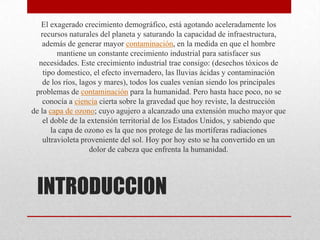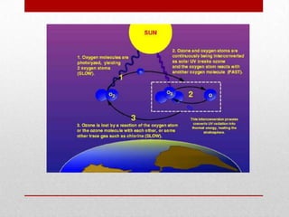 El documento habla sobre la capa de ozono, incluyendo su descubrimiento, su función de proteger la Tierra de las radiaciones ultravioleta del sol, y los problemas que enfrenta debido a la contaminación con clorofluorocarbonos y otros químicos. Explica que la capa de ozono se ha debilitado significativamente, creando un gran agujero sobre la Antártida, pero que los esfuerzos internacionales para reducir el uso de estos químicos han comenzado a mostrar resultados positivos, con una reducción en sus niveles atmosf
