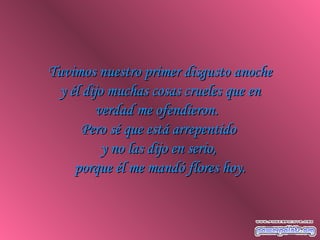 El documento describe la historia de una mujer en una relación abusiva con un hombre que la golpea repetidamente. A pesar de las agresiones físicas, ella cree que él está arrepentido porque le envía flores, aunque no sea un día especial. La violencia empeora con el tiempo, hasta que finalmente él la mata. El documento concluye instando a las personas en situaciones de violencia doméstica a buscar ayuda antes de que sea demasiado tarde.